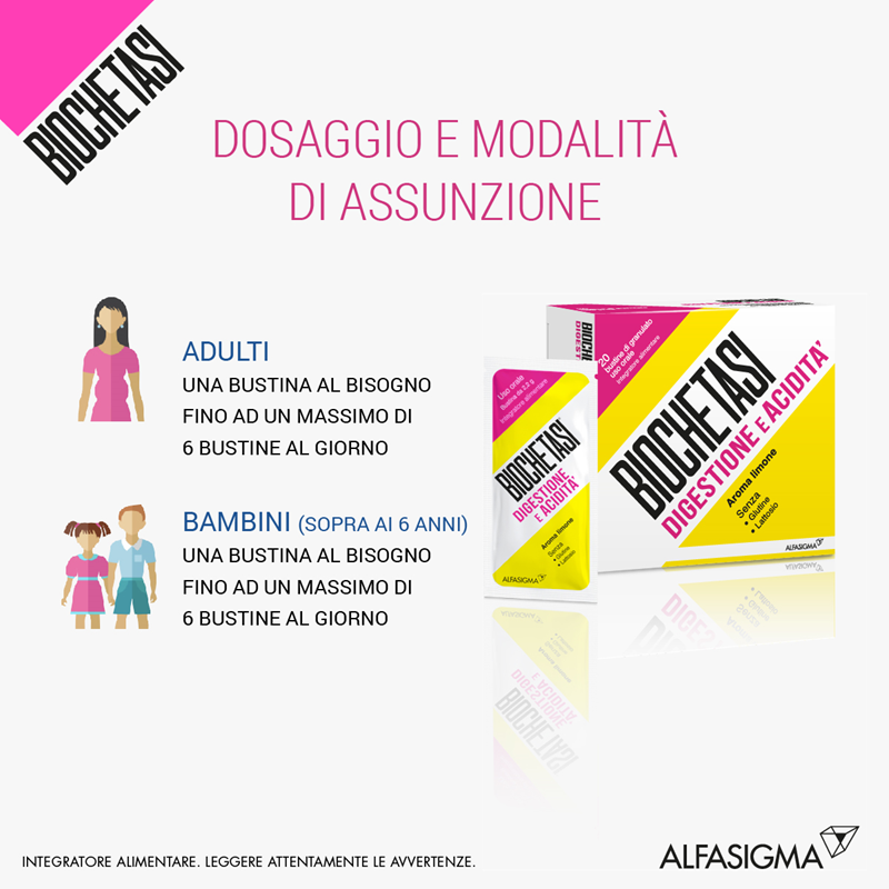Destinato ad adulti e bambini dai 6 anni in su. Assumere una bustina al bisogno, fino ad un massimo di 6 bustine al giorno. Sciogliere il contenuto in un bicchiere d'acqua (100 ml).